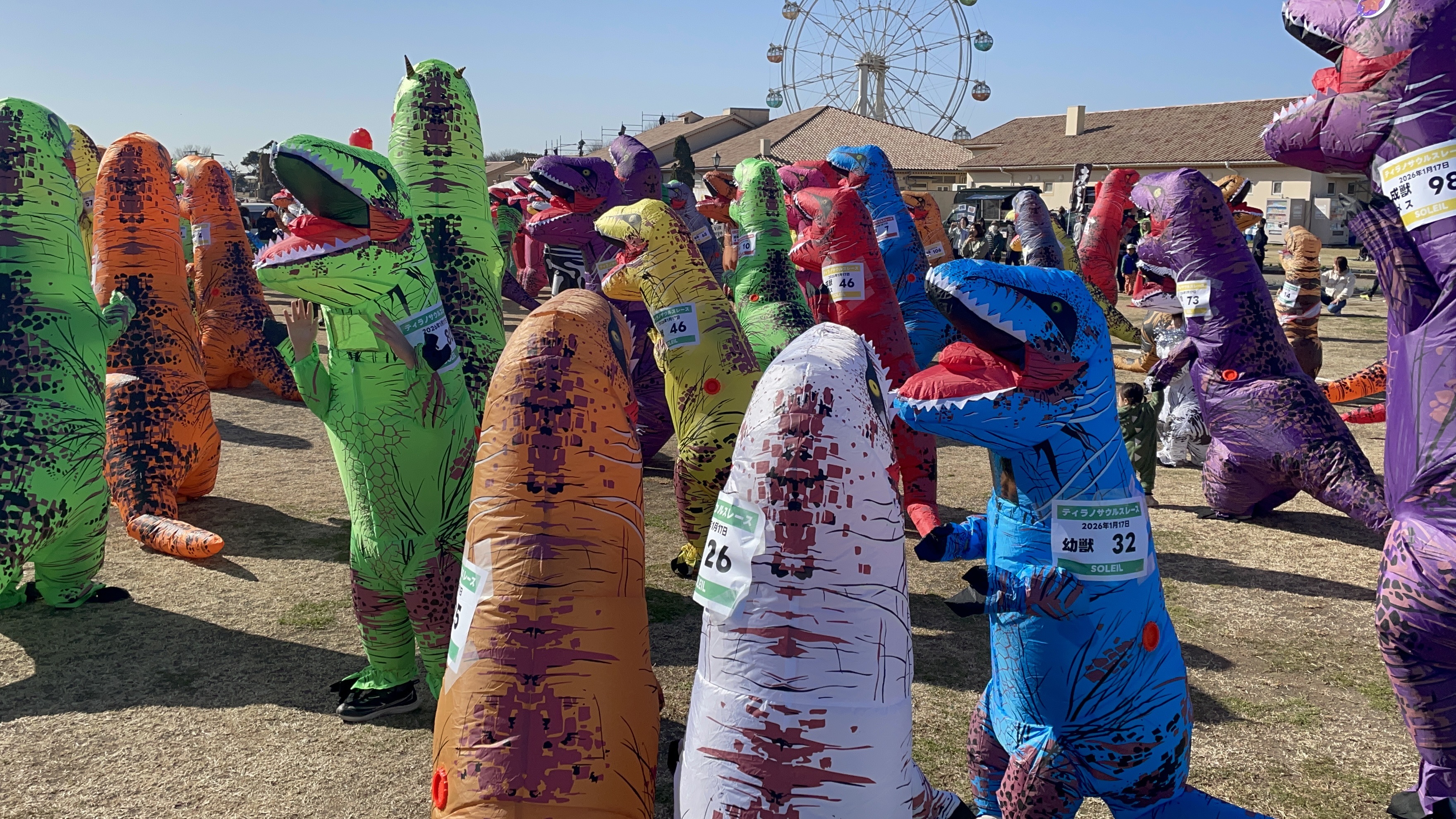 ※本商品の予約者数は、システムの都合上、前回大会までに予約いただいた方の人数も含まれて表示されています。 人数・日付選択ができる場合には、まだ予約が可能です。 ーーーーー 小学生以下のお子様は先着100名様限定!予約が埋まり次第受付終了となります。 ※キャンセル待ちの仕組み設定はございません。キャンセルが出ると、自動的に予約ができるようになります。 ※当日枠はございません。 ※ティラノサウルススーツのオプション販売も限定数にてご用意しています。 ーーーーー ソレイユの丘で毎回大好評のティラノサウルスレース! 皆さん一度は動画などで見たことある、あの姿になって、レースに参加してみませんか? 中学生以上の方々が参加できる『成獣の部』のほか、小学生以下の子どもたちが参加できる『幼獣の部』もご用意しており、公園を訪れる幅広い年代の方々にご参加いただけます。レース会場は、ソレイユ丘が誇る広大な芝生が魅力ののんびりはらっぱ。柔らかな芝生の上を、恐竜姿で全力で駆け抜ける爽快感を存分に味わう事ができ、レースの優勝者には、『オリジナルTシャツ、ソレイユの丘遊具回数券』などの豪華景品をプレゼントします。 当日は、ティラノサウルスの着ぐるみ姿で広い園内を散歩したり、園内にある飲食店で食事を楽しむなど、レース以外にも非日常な体験も。また、天気が良いと、富士山をバックにした特別な写真を撮る事が叶います。 ソレイユの丘で、三浦半島の自然を存分に味わいながら、恐竜たちが園内を駆け抜ける、大迫力のレースをお楽しみください。 日時:2026年1月17日(土)受付時間9:30~ 受付は9時30分から開始し、開会式の11時00分には、受付完了と、全ての参加の皆様のティラノスーツにレース番号ゼッケンの貼りつけ完了を目標としております。 ゼッケンの貼りつけにお時間をいただく場合がございますので、9時30分~10時30分の間になるべく早めにお越しいただけますと幸いです。 ※雨天決行・荒天時は中止する場合がございます。 ※参加により、イベント保険に自動加入しております。
